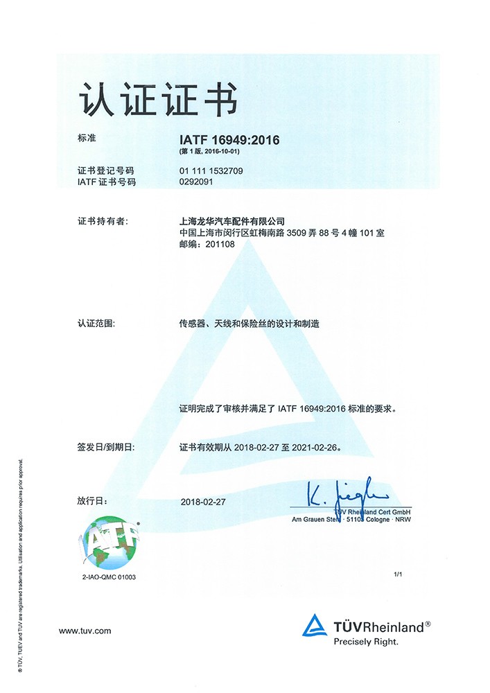 — 2018年2月通过IATF16949:2016 最新版质量体系认证,由莱茵公司颁发认证证书。