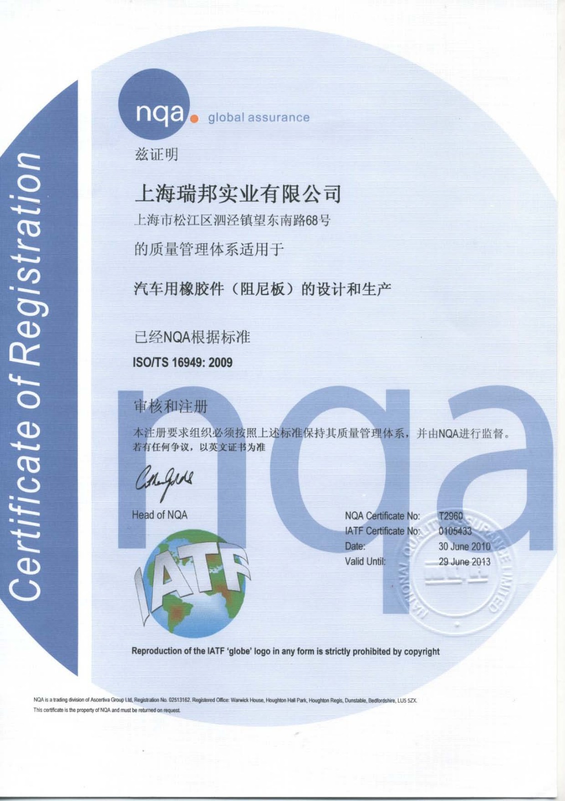 上海瑞邦实业有限公司,致力于专业生产自行开发的橡胶制品。包括减振阻尼产品、密封材料、各类橡胶制品、金属压铸等产品。 公司坐落于上海松江泗泾经济开发区,厂区占地面积20000M2,一幢综合办公楼,五个生产车间和一幢及员工休息、娱乐于一体的生活后勤大楼。 瑞邦公司具有先进的制造工艺,精良的加工设备,高素质的员工队伍。公司以“质量第一,顾客至上”的经营理念参与市场竞争。